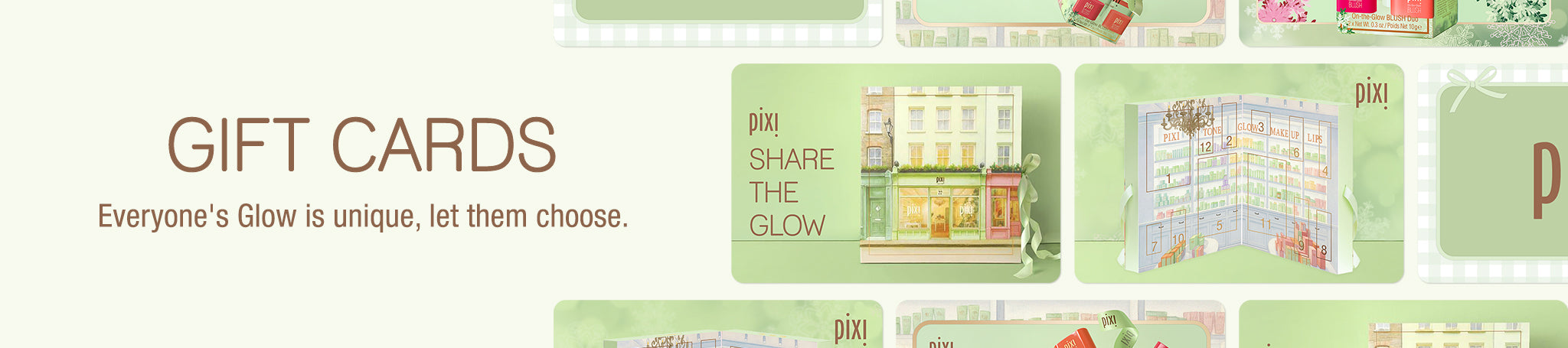 Share the Glow Pixi Gift Card with 12 Days of Icons Calendar Unwrap the Magic of Glow Pixi Gift Card with On-the-Glow BLUSH Petites Gift Set